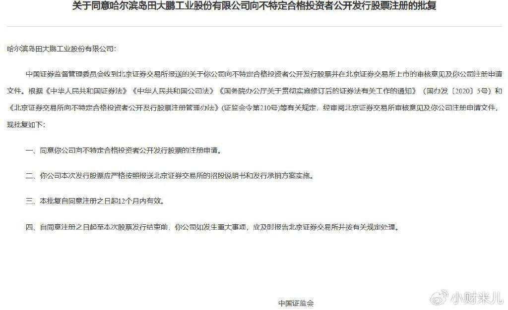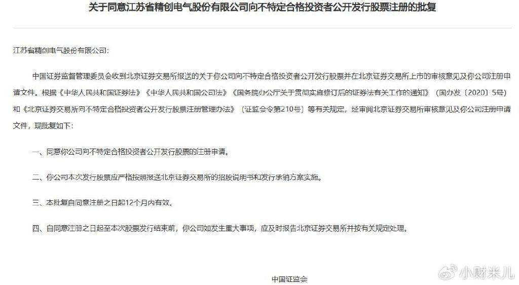 精创电气从停业务为冷链设备智能节制器、医药取食物冷链监测记实仪、制冷热泵检测仪表及颗粒物检测仪器等产物的研发、出产和发卖,并供给物联网和基于云的系统处理方案。公司供给的产物和办事次要包罗冷链设备智能节制器、节能电控箱、工业冷水机节制器;物联网记实仪、数字温度标签;红外检漏仪、智能歧管仪、智能实空泵等产物以及物联网、云计较等办事。公司产物及办事次要使用于制冷暖通(HVAC/R)、医药、食物和检测等行业或范畴。精创电气堆集了丰硕的智能节制及检测仪器仪表产物的研发取出产经验,具有专业化的冷链物联网财产,公司正在中国深圳、南京、上海、徐州,以及美国、英国、巴西均设有公司,营业广泛全球多个国度和地域。立异科技”的,一直专注于产物手艺立异。公司是国度级高新手艺企业、国度级专精特新“小巨人”企业,公司设有经中国及格评定国度承认委员会(CNAS)承认的查验和校准尝试室,并设有国度级博士后科研工做坐、江苏省制冷暖通节能节制工程手艺研究核心、江苏省冷链物联网工程核心、江苏省企业手艺核心、江苏省工业设想核心等多个科研平台。公司曾承担国度级火炬打算项目3项,省级火炬打算项目2项,其他国度及省部级科技项目9项。截至2025年8月20日,公司具有授权专利200项,此中发现专利27项,适用新型专利33项,外不雅设想专利185项;具有软件著做权91件,注册商标185件。2025年09月26日晚,证监会网坐披露,同意北交所企业岛田大鹏工业股份无限公司向不特定及格投资者公开辟行股票注册的批复。