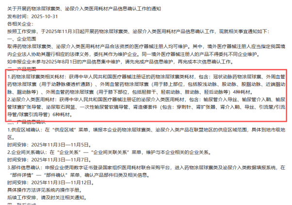 做为2025年下半年最受关心的国度级集采,第六批国采于10月31日由天津医药采购核心明白品类范畴,目前已进入产物消息确认阶段,距离正式开标仅剩1-2个月(来历:天津医药采购核心《关于开展药物涂层球囊类、泌尿介入类医用耗材产物消息确认工做的通知》)。此次集采次要是聚焦临床利用率高、价钱弹性大、合作款式成熟的两大范畴,10类产物均为手术必备的“刚需耗材”。(1)品类筛选:从25类精简至10类,只留“临床不成缺”此前8月的准备通知曾初步圈定25类泌尿介入耗材,最终连系临床反馈精简至10类,此中药物涂层球囊4类、泌尿介入类6类,均合适“手术根本性强、利用率近乎100%”的尺度。(2)产物明细:笼盖心脑血管、泌尿两大高发疾病范畴两大品类精准对应我国高发疾病医治需求,以药物涂层球囊为例,仅冠状动脉用品种就笼盖超400万冠心病患者的介入医治;泌尿介入类则对准我国10%的肾结石患病率群体,相关耗材年利用量超万万套。具体产物及临床价值如下:
